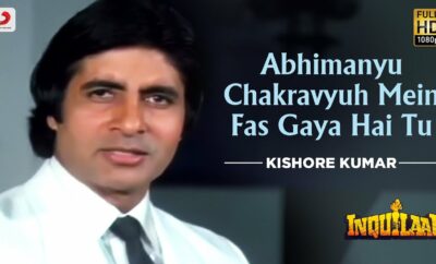 Movie: InquilaabRelease: 1984Featuring Actors: Amitabh Bachchan, SrideviMusic Director: Laxmikant PyarelalLyrics: Anand Bakshi.Singer: Kishore KumarTrivia: Lyrics in Hindi अभिमन्युअभिमन्यु...