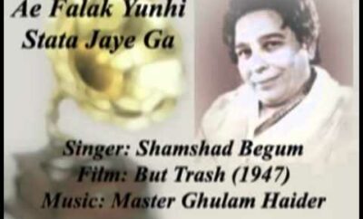 Movie: But TaraashRelease: 1951Featuring Actors: Arshad, ManoramaMusic Directors: Ghulam HaiderLyrics: Singers: Shamshad BegumTrivia: Lyrics in Hindi ए फ़लकए...