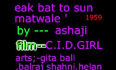 Movie: C.I.D. GirlRelease: 1959Featuring Actors: Balraj Sahni, Geeta BaliMusic Directors: RoshanLyrics: Anand BakshiSingers: Asha Bhosle, Mohammed RafiTrivia: Lyrics...