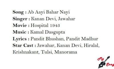 Movie: HospitalRelease: 1943Featuring Actors: ManoramaMusic Director: Kamal DasguptaLyrics: Pandit BhushanSinger: Kanan DeviTrivia: Lyrics in Hindi अब आयी बहार...